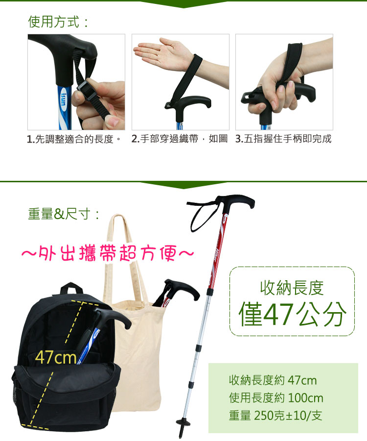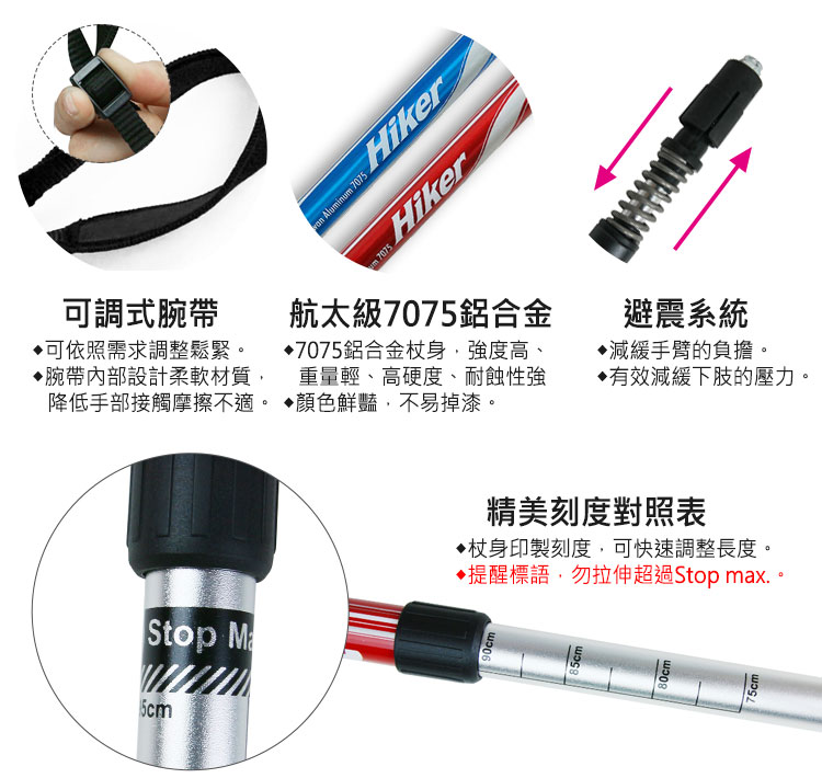 主要成分:材質/7075航太鋁合金、杖尖/鉻鉬鋼、腕帶/聚丙烯、握把/聚丙烯