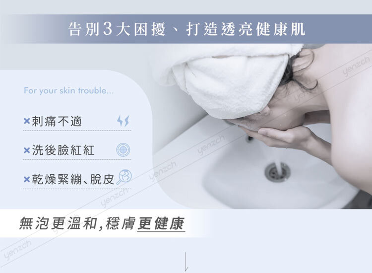 - ● 乾手乾臉、無須搓揉起泡,按摩後以清水沖洗乾淨即可
