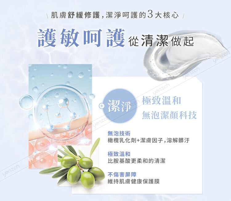 - ● 橄欖乳化劑+潔膚因子溶解髒汙