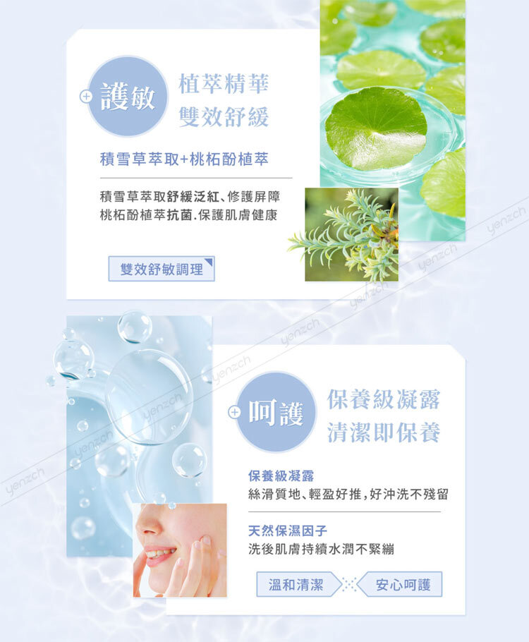 - ● 雙效舒緩植萃精華,積雪草萃取+桃柘酚植萃抗菌保護肌膚