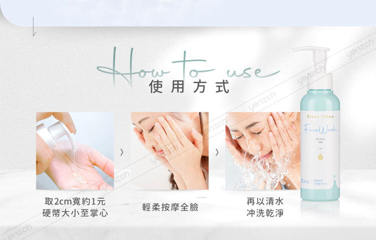 使用方式:乾手乾臉、無須搓揉起泡,按摩後以清水沖洗乾淨即可