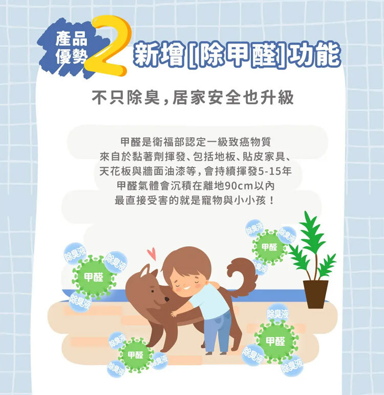 可輕鬆分解室內的甲醛,去除寵物環境意味的同時,也一併分解甲醛,讓寵物與主人居家生活更安全