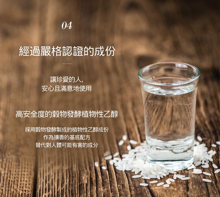 ◆使用穀物發酵植物性乙醇,安全度高
