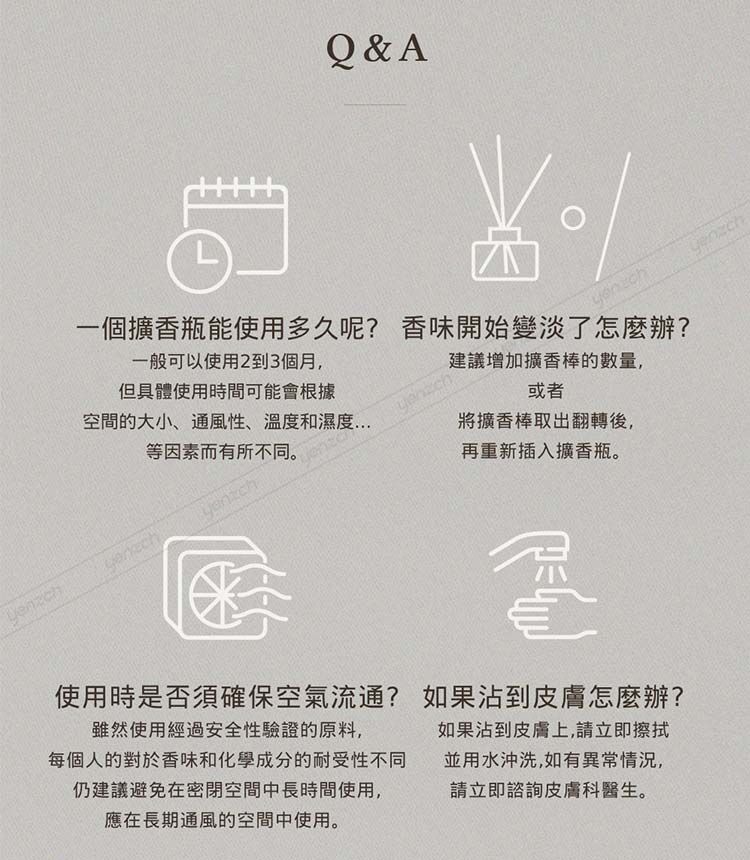 .一般擴香使用期限為開瓶後約90天,若想要增加持久度建議「將擴香瓶擺放在室內陰涼通風處,避免陽光直射」。